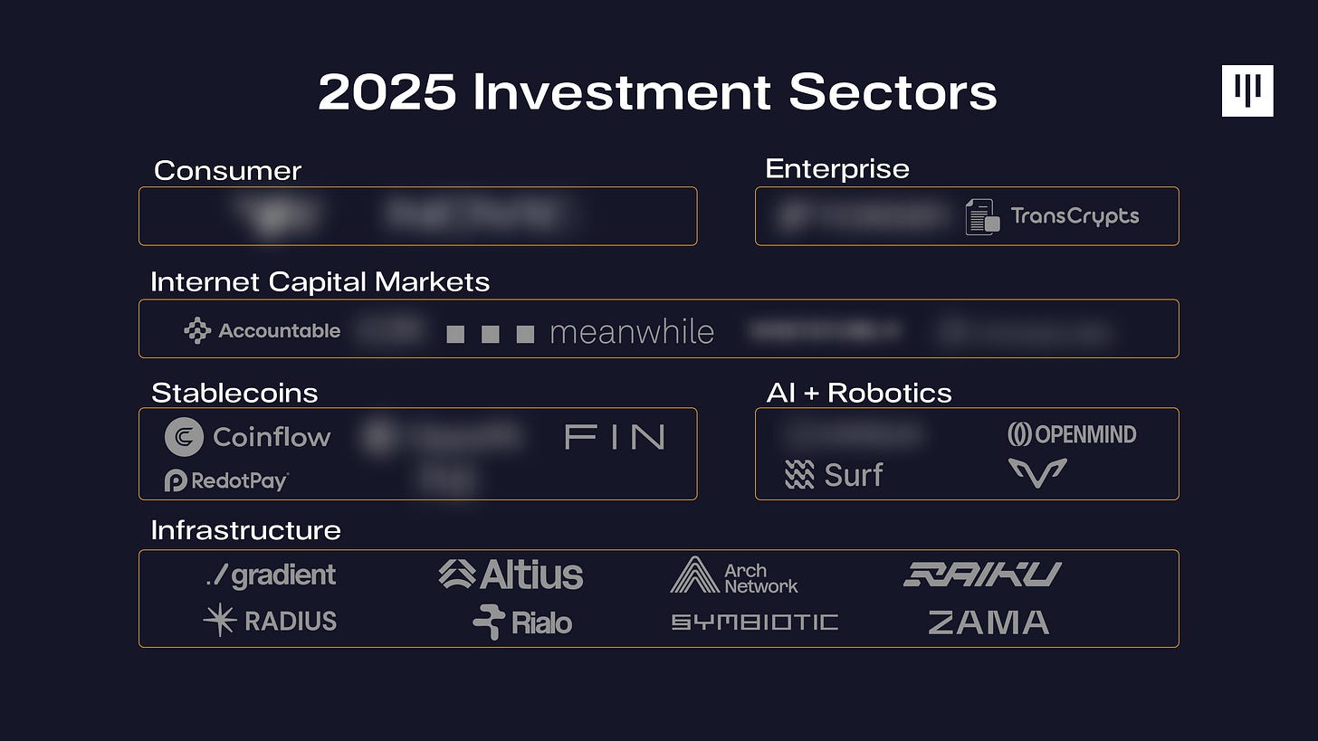Specific investments named in this document were invested during 2025 and have publicly announced funding rounds disclosing Pantera Capital as an investor. Selection criteria were based on announcement status and timing, not performance. These examples do not represent all investments made in 2025, and Pantera has made additional investments that remain confidential or unannounced.