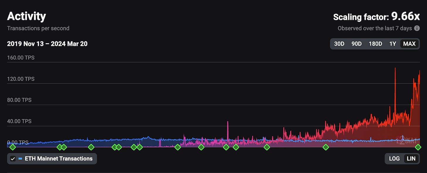Rollups are the present and future of Ethereum scaling. After a gradual increase in usage from 2021 to 2023, rollup adoption has recently accelerated, providing Ethereum L1 with a nearly 10x increase in transaction throughput.