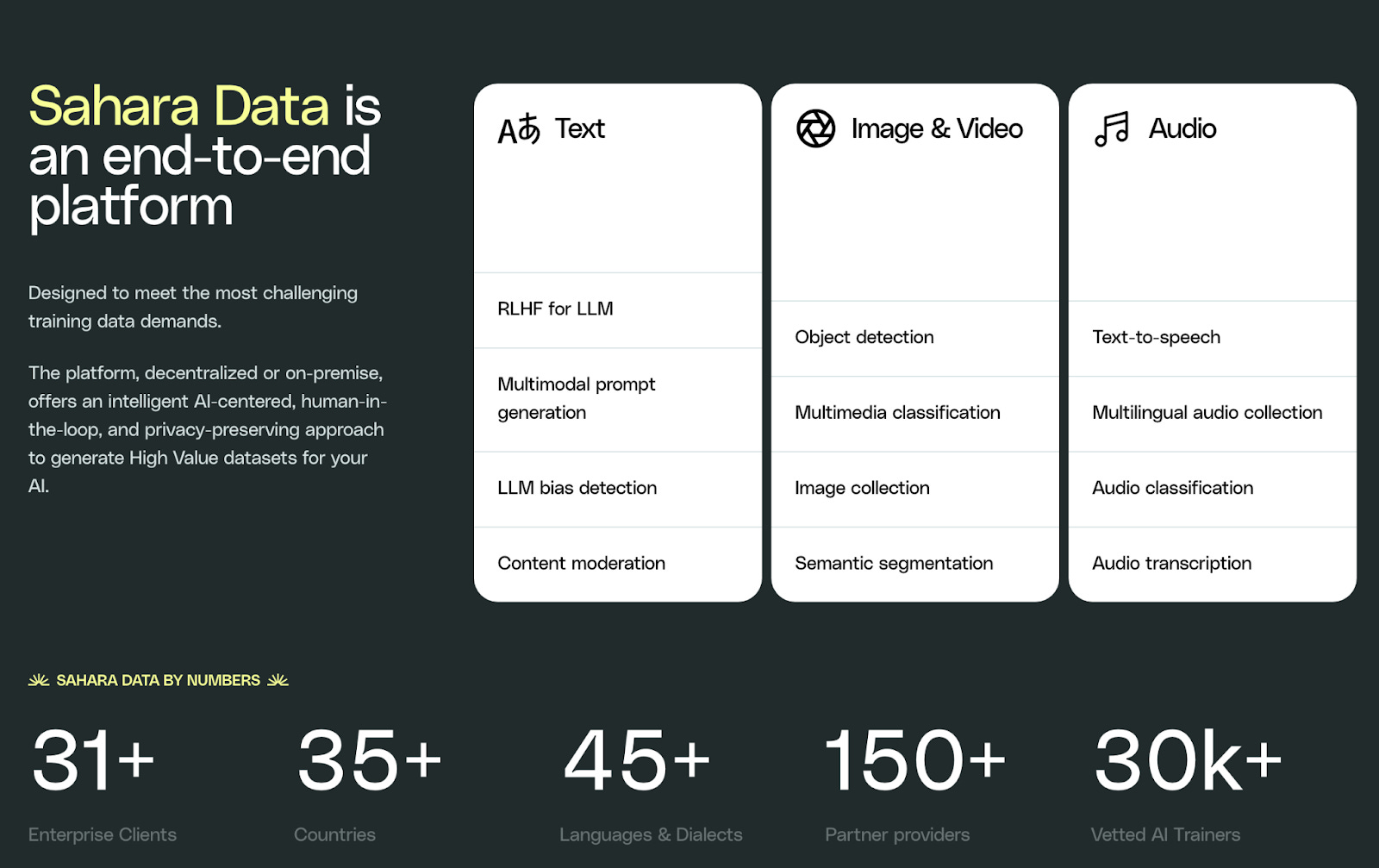 Corporations can also pay to generate Sahara Data, which melds AI Automatic Labeling and Human Labeling in order to efficiently create high-quality, privacy preserving, multimodal datasets.