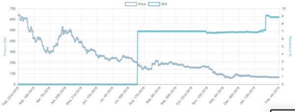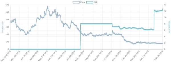 Staking return rates have been going up over time, too. Below you can see the change in annual yield and price for three of the biggest staking markets: DASH, Cosmos, and Decred.